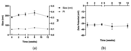 To study the stability of the freeze-dried DX NC-imq*, the samples were resuspended in 1 mL of Milli-Q water at different times (0, 2, 4, 8, and 12 weeks) to measure their physicochemical characterization (size, polydispersity index, and zeta potential) according to Section 2.3.
