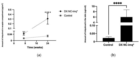 Studies of transdermal permeation and retention of imiquimod in the designed nanosystem. (a) Transdermal penetration of imiquimod carried in DX NC-imq*. (b) Imiquimod skin retention at the end of the transdermal studies. DX NC-imq*: dextran nanocapsules with imiquimod in their core. * Formulation elaborated applying high manual pressure. (Mean ± SD, n = 6). **** Statistically significant (p < 0.01).