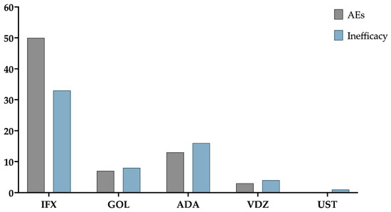 Patients with adverse events (AEs) and inefficacy. IFX: infliximab; ADA: adalimumab; GOL: golimumab; VDZ: vedolizumab; UST: ustekinumab.
