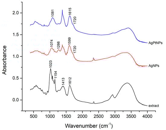 FT−IR spectra of basil extract (without NPs), AgNPs extract, and AgPtNPs extract. The star refers to carbon dioxide.