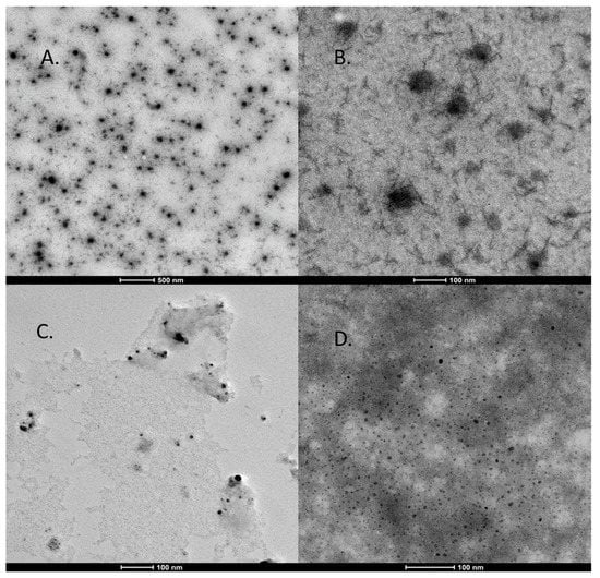 Further, the morphological characterizations of the AgPtNPs were confirmed by TEM analysis. Very small independent particles forming nanoclusters with an overall size distribution from 20 to 80 nm and an average of 59 nm were identified (Figure 6). Interestingly, the AgPtNPs showed an inner core of silver and outer core of platinum (Figure 6 A,B). While Figure 6C only shows AgNPs with very tiny sizes around 5–10 nm, Figure 6D shows the hollow PtNPs with average sizes of 10–20 nm. The results suggested that the AgPtNPs had a spherical shape with a shell structure, in which the inner core was of silver and the outer core of platinum. The chemical mechanism of the structure formation is not known yet, and needs to be explored in further studies.