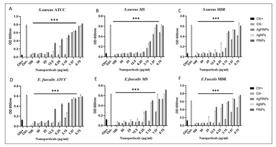 Analysis of AgPtNPs by MIC against ATCC, MS and MDR Gram-positive. (A–C) indicate the analysis against all S. aureus strains and (D–F) against E. faecalis. Ctlr+ indicates bacteria treated with antibiotic, while Ctlr− represents non-treated bacteria. Data are relative to Ctlr – and represent the mean ± standard deviation (SD). Significant diff. among means (*** p < 0.05).