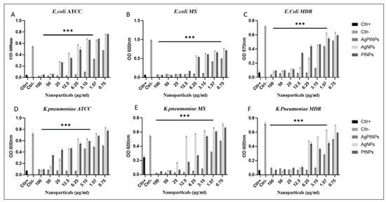 Analysis of AgPtNPs by MIC against ATCC, MS and MDR Gram-negative bacterial pathogens. (A–C) indicate the analysis against all E. coli and (D–F) against K. pneumoniae. Data are means of three independent experiments. Ctlr+ indicates bacteria treated with antibiotic, while Ctlr− represents not-treated bacteria. Data are relative to Ctlr – and represent the mean ± standard deviation (SD). Significant diff. among means (*** p < 0.05).