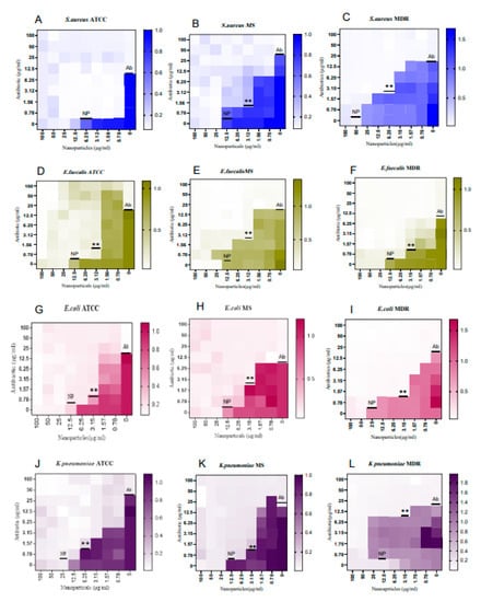 Synergistic, additive or antagonistic effect against AgPtNPs and antibiotics (ampicillin and vancomycin). (A–C) panels clarify the synergistic effect against S. aureus ATCC, MS and MDR bacterial strain. (D−F) panels indicate the additive effect against E. faecalis ATCC, MS and MDR bacterial strains. (G–I) panels indicate the synergistic effect against E. coli ATCC, MS and MDR bacterial strains. Lastly, (J–L) panels indicate the additive and synergistic effects against K. pneumoniae ATCC, MS and MDR bacterial strain. NP: nanoparticles; Ab: antibiotic. Data are means of three independent experiments. Significant diff. among means **: p < 0.01.