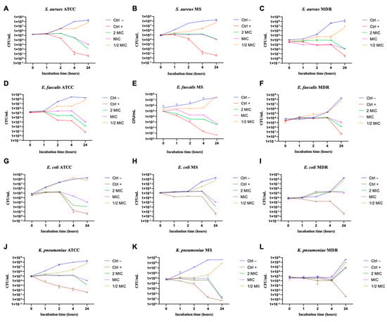 To understand the NPs’ kinetic action against the tested bacteria a time-killing assay was performed. The data obtained showed exponential bacterial growth over time without treatment (CTRL–) and with NPs ½ × MIC value. Exposure to 2xMIC and MIC value maintained the bacterial load at constant over time, suggesting a bacteriostatic action. A significant decrease in the CFU number of ATCC, MS, and MDR bacterial pathogens was observed after 24 h of incubation with AgPtNPs. The only exception was the MDR E. coli and K. pneumoniae strains, which showed comparatively less reduction in CFU. The overall results showed a partial bactericidal effect. On the contrary, NPs showed a bacteriostatic effect against E. coli (Figure 10G–I) and K. pneumoniae (Figure 10J,L).
