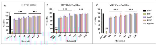 To assess the cytotoxicity of NPs, a 3-(4,5-dimethylthiazol-2-yl)-2,5-diphenyltetrazolium bromide (MTT) assay was performed on the African green monkey cell line (Vero), Human immortalized keratinocytes cells (HaCaT) and Colon carcinoma cells (Caco-2) cell line. Cells were plated in DMEM (Thermo Fisher Scientific, Waltham, MA, USA), supplemented with 1% penicillin–streptomycin and 10% fetal bovine serum (Thermo Fisher Scientific, Waltham, MA, USA), at 37 °C, with 5% CO2 in a humid environment. A density of 2 × 104 cells/well was seeded into 96-well plates and incubated for 24 h. The day after, cells were treated with AgPtNPs, AgNPs and PtNPs at different concentrations ranging from 3.15 to 100 μg/mL. After 24 h, MTT solution was added to each well and plates were incubated for an additional 3 h at 37 °C. Then, formazan crystals were dissolved with DMSO 100% and the absorbance was measured at OD 570 nm using a microplate reader (Tecan, Männedorf, Switzerland).