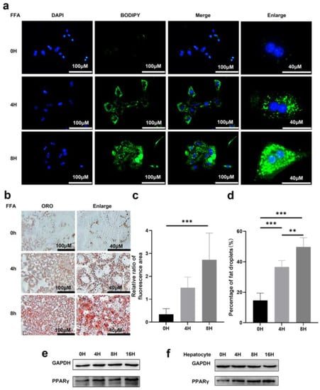 Lipid droplets can be induced by free fatty acid in hepatocytes. (a) Representative images of DAPI and BODIPY staining of primary hepatocytes treated with 1 mM FFA for indicated time. Scale bar: 40 μM and 100 μM. (b) Representative images of oil red O staining (ORO) of primary hepatocytes with indicated treatments. Scale bar: 40 μM and 100 μM. (c) Relative ratio of fluorescence area of DAPI and BODIPY staining were quantified. (d) Statistical analysis of area of fat droplets stained with oil red O (ORO) were presented. Huh7 cells (e) and primary hepatocytes (f) were treated with 1 mM FFA for 0, 4, 8, 16 h. Representative images of western blot showed the effects of FFA on PPARγ expression. GAPDH was used as an invariant control. Data represents the mean ± SD, n ≥ 3. One-way ANOVA was used for statistical analysis (** p < 0.01, *** p < 0.001).