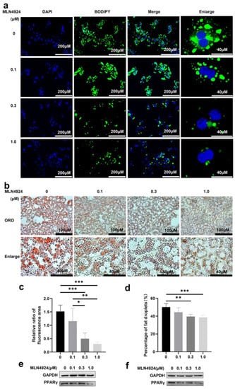 Neddylation inhibitor MLN4924 can inhibit lipid droplets induction by free fatty acid in hepatocytes. Primary hepatocytes were treated with 0, 0.1, 0.3 or 1 μM MLN4924 and 1 mM FFA for 8 h. Representative images of DAPI, BODIPY staining (a) and oil red O staining (ORO) (b) were presented. Scale bar: 40 μM and 200 μM for DAPI, BODIPY image, 40 μM and 100 μM for oil red O staining image. (c) Relative ratio of fluorescence area of DAPI and BODIPY staining were quantified. (d) Statistical analysis of area of fat droplets stained with oil red O (ORO) were presented. Huh7 cells (e) and primary hepatocytes (f) were treated with 0, 0.1, 0.3 or 1 μM MLN4924 and 1 mM FFA for 16 h. Representative images of western blot showed the effects of FFA on PPARγ expression. GAPDH was used as an invariant control. Data represents the mean ± SD, n ≥ 3. One-way ANOVA was used for statistical analysis (* p < 0.05, ** p < 0.01, *** p < 0.001).