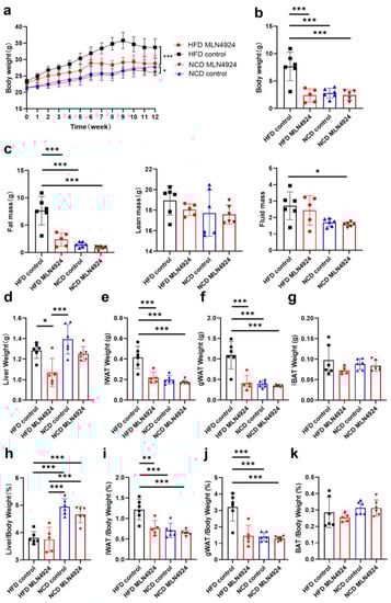 After 12 weeks of feeding, fat mass, lean mass and fluid mass of the mice from all four groups were measured by the animal NMR analyzer. The average fat mass of mice from the HFD-MLN4924 group was only 2.38 g, which was about 5.28 g less (p < 0.001) than those from the HFD-control group (Figure 3c). Whereas no differences in fat mass, lean mass or fluid mass were observed between the NCD groups (Figure 3c). At the end point of feeding, the mice were sacrificed for further analysis. The weights of liver, iWAT, gWAT and BAT from all the animals were first weighed and analyzed (Figure 3d–k). The size of the livers from HFD-fed mice were larger than those from NCD-fed mice, which was consistent with previous reports []. The average weights of liver, iWAT and gWAT from mice in the HFD-MLN4924 group were all markedly decreased compared to those from the HFD-control group (15.63%, 47.29%, 62.27%, respectively) (Figure 3d–f). The percentages of iWAT or gWAT weight in total body weight were also lower in mice from the HFD-MLN4924 group, with average iWAT and gWAT weight percentage of body weight being 0.77% vs. 1.22% (p = 0.0031), 1.45% vs. 3.21% (p = 0.0002) in animals from the HFD-MLN4924 and HFD-control groups, respectively (Figure 3i,j). In contrast, there were no significant differences in the weights of BAT tissue across all four groups (Figure 3g,k). In conclusion, MLN4924 primarily regulates lipid metabolism in liver and white adipose tissue while whether it has effects on brown adipose tissue remains to be explored.
