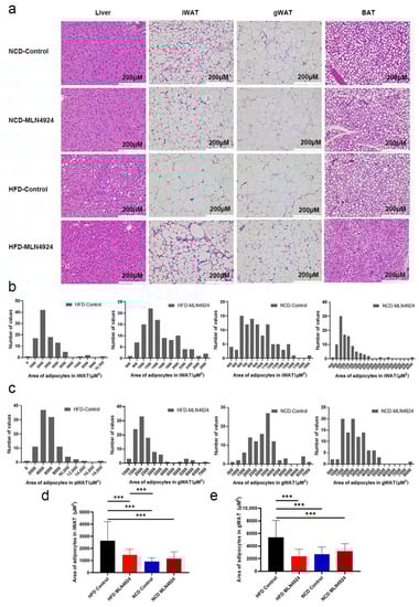 To determine whether MLN4924 has an effect on metabolic tissues, histology examination was performed on liver and adipose tissues. It was found that there was almost no fat accumulation in the liver of mice from the HFD-MLN4924 group, while there were a number of white vacuoles in the liver of mice from the HFD-Control group, indicating that some hepatocytes had undergone ballooning degeneration (Figure 4a). These results indicated that MLN4924 played an important role in preventing or relieving hepatic steatosis. In addition, H & E staining of BAT exhibited smaller adipocytes with a high density of intracellular organelles from mice of the HFD-MLN4924 group compared to that from the HFD-Control group (Figure 4a), suggesting MLN4924 treatment may induce active BAT and a subsequent increase in energy expenditure in animal models []. Next, the size of adipocyte was measured using histological sections of iWAT and gWAT tissues of mice from all four groups. An area of 100 random adipocytes from each sample was measured and the statistical distribution map of adipocyte size in animals from the four groups was obtained (Figure 4b,c). The adipocyte size of gWAT and iWAT from the HFD-MLN4924 group was much smaller than that from the HFD-Control group, and was comparable to that from the NCD groups (p < 0.001), indicating that MLN4924 could reduce the accumulation of lipid in adipose tissues in mice (Figure 4d,e).