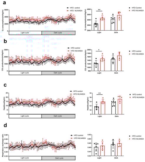 To determine whether reduced body weight and fat mass in the HFD-MLN4924 group was the consequence of increased metabolism, the metabolic rate of the mice from all four groups were measured. It was found that the daytime O2 consumption, CO2 production and heat production of mice from the HFD-MLN4924 group were significantly higher than those from the HFD-Control group, while the respiratory quotients were comparable between the two groups (Figure 5a–d). The nocturnal O2 consumption, CO2 production and heat of mice from the HFD-MLN4924 group showed a trend of increase compared with those from the HFD-Control group, although there were no statistical differences (Figure 5a–d). These results demonstrated that neddylation inhibitor MLN4924 enhanced lipid consumption in HFD-fed mice, resulting in a lean phenotype and reduced accumulation of fat in the liver in these animals. This finding was also consistent with a previous report, which underscored the importance of MLN4924 in ameliorating lipid accumulation in mice [].