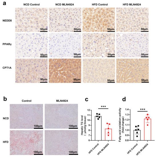 Recent studies have demonstrated the importance of neddylation, a ubiquitin-like posttranslational modification in the process of chronic liver diseases progression, and yet, the underlying mechanisms were complicated and largely unknown []. Studies have reported that patients with hepatocellular carcinoma, intrahepatic cholangiocarcinoma, as well as mouse models of liver fibrosis all showed a notable increase in the global neddylated-proteome and neddylation intermediates [,]. In 2009, Soucy et al. first demonstrated a small molecule inhibitor of neddylation, MLN4924 (pevonedistat) disrupts cullin-RING ligase-mediated protein turnover []. It was reported that MLN4924 can trigger cell cycle arrest, apoptosis and senescence in cancer cells through blocking cullin neddylation, and inactivates CRL, which results in the accumulation of CRL substrates [,,]. Pre-clinical-based research also provided strong evidence that neddylation inhibition is potentially an effective and safe therapeutic target in the  context of drug development [,]. Previous findings showed that the levels of NEDD8 protein were increased in patients with hepatic steatosis compared to those in healthy controls. Oxidative stress, one of the key pathological features in the progression of NAFLD, could be related to the activation of neddylation [,,]. Interestingly, our results showed that MLN4924 almost reversed the phenotypes of NAFLD induced by HFD, namely histological steatosis (Figure 4a), compared with mice fed with NCD. However, the effects of MLN4924 on non-alcoholic steatohepatitis (NASH) have not been reported and the relationship between neddylation and inflammation in NASH still remained to be discovered. Nevertheless, in our model, we found that after 12 weeks of HFD or NCD feeding, the liver tissues of mice injected with or without MLN4924 showed no pathological changes of fibrosis (Figure S4). Additionally, the levels of macrophage infiltration indicated by F4/80 staining in the liver of animals from the HFD-MLN4924 group were lower than that from the HFD-Control group, indicating that MLN4924 could alleviate the hepatic inflammation caused by HFD (Figure S4).