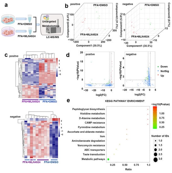 Lipidomics analysis on liver lipid metabolism after treatment of neddylation inhibitor MLN4924. (a) Huh7 cells were divided into FFA + DMSO and FFA + MLN4924 groups. LC-MS–based nontargeted metabolomic analysis detecting differential metabolites between two groups (n = 6 per group). (b) PLS-DA three-dimensional score plots for FFA + DMSO and FFA + MLN4924 groups. Images showed global sample distribution profiles analyzed by PLS-DA with the positive ion mode on the left and negative ion mode on the right. (c) Heatmap presented differentially expressed metabolites in FFA + DMSO group and FFA + MLN4924 group with the positive ion mode above and negative ion mode below. (d) Volcano plot showed lipidomics analysis of FFA + DMSO group and FFA + MLN4924 group with the positive ion mode on the left and negative ion mode on the right. The red dot represented the fold change (FC) > 2.0 and p value < 0.05. The green dot represents FC < 0.5, and p value < 0.05. (e) KEGG pathway enrichment analysis presented the main metabolic pathways identified between FFA + DMSO group and FFA + MLN4924 group by metabolites annotated to KEGG database.