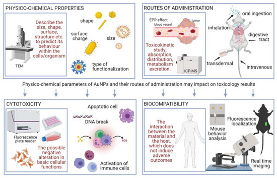 Schematic presentation of the various aspects regulating the biocompatibility and safety implications associated with nanoparticles, e.g., particle size or hydrodynamic diameters, nanoparticle shape and surface morphological characteristics, and routes through which nanoparticles are administered into the patients, considerably regulate the safety and toxicological outcomes including the adverse effects (viz. apoptotic changes, reactive oxygen species yield, abnormality in animals’ behaviors, etc.). These prospects can be assessed on cellular or organismic levels (reproduced with permission from [32]).
