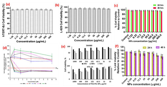 Safety and toxicity assessment of different nanocarriers in vitro. (a–c) Assessment of safety and toxicity of blank and drug-loaded chitosan NPs in dose-dependent and time-dependent manner (reproduced from [82] with permission from the American Chemical Society). (d) Viability of two cancer cell lines (HeLa and A549) treated with free compound and its loaded nanocarriers, F1, F2, F8, and F9 (reproduced from [84]). (e) Cytotoxicity analysis of PEG-PCL NPs with encapsulated Man-PEI/plasmid complexes in SW480 and HCT-15 cells, reproduced from [83]. (f) MTT assay for cytocompatibility of PCL-AC-gel NPs towards normal human foreskin fibroblasts (hTERT-BJ) cells (reproduced from [19] with permission from the Royal Society of Chemistry).