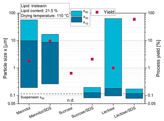 Effect of the matrix material on the size of tristearin nanoparticles after redispersion of lipid-containing powders in water and on the yield of the spray-drying process (n.d. = not determinable).