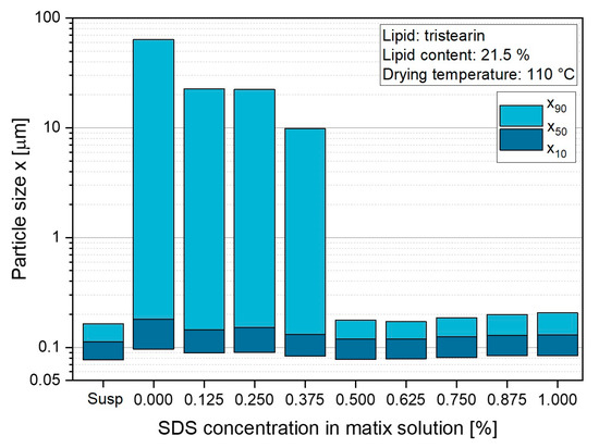 Influence of the SDS concentration in the lactose matrix solution as reflected by the size of the tristearin particles redispersed from the dried powders compared to that of the suspension (susp) before drying.