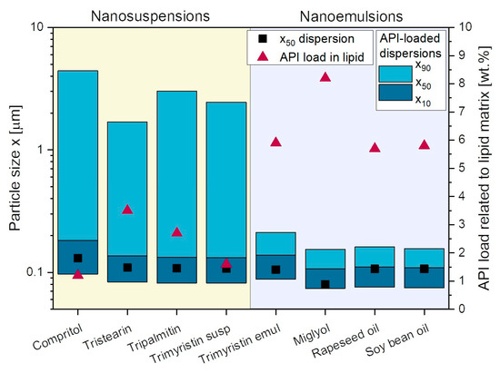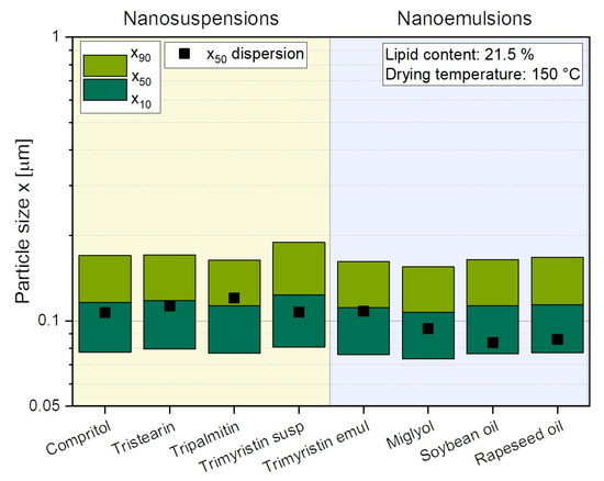 Using the additives PVA/SDS to stabilize the nanodispersions during high-pressure homogenization, nanosuspensions as well as -emulsions with particle sizes between x50 = 85 nm and 120 nm were obtained (Figure 4). These lipid dispersions were then spray-dried and the powders redispersed in water before size measurement. The resulting particle sizes showed that all lipid-containing powders (lipid content in powder 21.5 wt.%) could be successfully redispersed in water, with only an increase in particle size x50 of at maximum 29 nm (for soybean oil) and no x90 value above 200 nm.