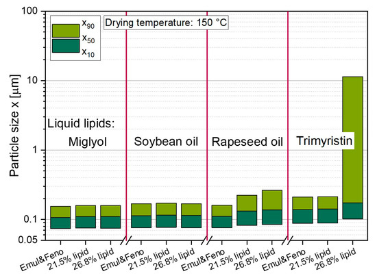 The results of the spray-dried lipid nanoemulsions indicate that after loading the lipid droplets with FENO, the nanoparticulate properties of the initial emulsions were maintained (Figure 6). Only a slight increase in particle sizes was observed, resulting in dispersions with a x50 between 107 nm and 138 nm. The two powders containing the API-loaded Miglyol and soybean oil emulsion did not show any increase in particle size after spray drying of the nanoemulsions, and the results also indicated that the lipid content in the powders did not affect the resulting particle sizes. For the powders in which rapeseed oil was embedded, a slight increase in droplet size of approx. 20 nm was observed. For rapeseed oil emulsions, it was also found that the x90 gradually increased with higher lipid contents in the dried powders. Coalescence of the droplets was evident when 26.8 wt.% of trimyristin droplets were embedded in the lactose/SDS matrix, while this phenomenon did not occur when the lipid content in the dried powders was lower.