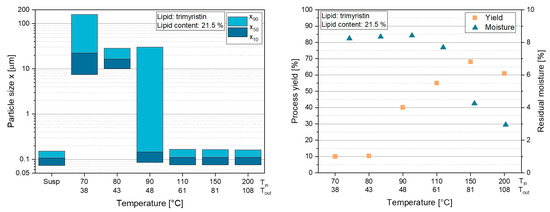 To investigate the process performance as a function of the drying temperature, trimyristin nanosuspensions (x50 = 107 nm) were spray-dried at Tin between 70 °C and 200 °C. The resulting Tout ranged from 38 °C and 108 °C for these formulations (Figure 7).