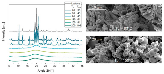 A significant influence of the drying temperature on the amorphous and crystalline state of the trimyristin-containing powders was observed (Figure 8, left). Compared to the lactose starting material, which exhibited characteristic reflections at, for example, approx. 12.5, 17, and 22° 2θ, the absence of these reflections indicated an amorphous state of the lactose matrix when the formulations were dried at temperatures of Tin = 110 °C and higher. However, a very pronounced crystalline structure was observed when the trimyristin suspension was dried at Tin = 70 and 80 °C. For the powder spray-dried at Tin = 90 °C, a combination of both physical states, crystalline and amorphous, was observed. SEM images of two powders dried at different temperatures (Tin = 80 °C and 150 °C) confirmed these findings (Figure 8, right). While a platelet-like structure of the lactose was identified in the crystalline sample dried at Tin = 80 °C, the lactose matrix particles dried at Tin = 150 °C had a spherical shape. These findings exhibited a direct correlation with the particle sizes after redispersion of the powders. Good redispersibility of the powders was obtained when the formulations were dried at Tin = 110 °C and higher, resulting in an embedding of the trimyristin particles in an amorphous lactose matrix. When the formulation contained crystalline lactose particles after drying, a poor redispersibility was obtained, as shown at Tin = 70 °C and 80 °C. Partially small particles but also large agglomerates were redispersed from the powders when trimyristin was embedded in a lactose matrix, which contained both crystalline as well as amorphous components (Tin = 90 °C). Correlations could be made with the previously used matrix material mannitol (Section 3.1.1), which also embedded the dispersions in a crystalline structure and did not allow a suitable redispersion of the lipid nanoparticles from the dried powders regardless of the addition of the surfactant SDS. In conclusion, drying temperatures between Tin = 110 °C and 200 °C were advantageous, as good redispersibility of the particles was achieved by embedding them in an amorphous lactose matrix and high process yields were obtained under these conditions.