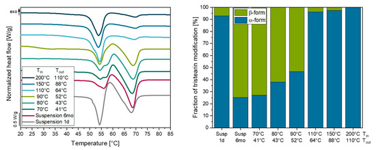 Drying the suspension at the lowest temperature, Tin = 70 °C, resulting in Tout = 41 °C, did not significantly change the fraction of tristearin particles in the α- or β-modification. A slight decrease in the fraction in the β-modification was observed when the tristearin formulation was dried at Tin = 80 °C and 90 °C (Tout = 43 °C and 52 °C, respectively). It was assumed in this study that a decreased fraction of particles in the stable β-polymorphic form could only occur if the particles melted during the drying process and re-crystallized in the metastable α-modification. Apparently, only a small to moderate fraction of particles melted during the drying process and re-crystallized into the metastable α-form at process temperatures up to 90 °C. A significant increase in the fraction of tristearin particles in the α-modification was observed when the suspension was spray-dried at Tin = 110 °C and higher, resulting in Tout of at least 64 °C. It was concluded that at these process temperatures (almost), all particles must have melted during the spray-drying process and afterward crystallized in the α-polymorphic form. Previous studies already attempted to estimate the temperature exposure of the particles during the drying process, as direct measurements have not been possible so far. As for the results obtained in this study, the temperature exposure was derived from the fraction of α- and β-modification in the tristearin-containing powders. It seemed to be higher than previously expected by other research groups [15,16,17], as the DSC curves indicated that the majority of the nanoparticles in the β-modification melt at approx. 68 °C (heating rate 10 K min−1, similar results were obtained also at lower heating rates (data not shown)), determined at the maximum of the melting curve of the suspension (Figure 9, left). Computer simulations examining the path of the sprayed particles through the spray-drying tower during drying showed that the particles did not only move on the centerline but could also recirculate in the tower, which would explain the temperature exposure of particles above Tout [34,35]. Generally, however, in this study, it was assumed that the described phenomenon may depend on the type of spray dryer used as well as on process parameters. In the current study, no recirculation of the particles was visually detected, but it could not be ruled out either. In this regard, further experiments should be conducted to determine the actual temperatures the particles are exposed to during the drying process. Lipid nanoparticles that exhibit peculiar melting and recrystallization phenomena (e.g., also in dependence on particle size) may serve as valuable probes for this purpose.