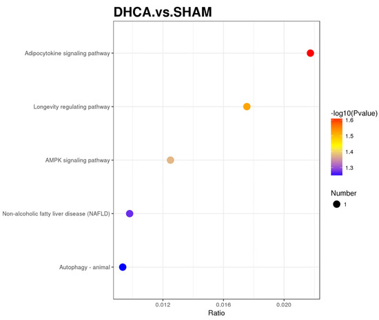 In order to explore the mechanism of central nervous system injury after the DHCA procedure, the different expression proteins of hippocampus which are sensitive to ischemia and hypoxia were investigated. After DHCA, 19 different expression proteins were found—5 proteins were upregulated and 14 proteins were downregulated (Figure 1A,B). Adiponectin receptor 1 (AdipoR 1) protein was among the five upregulated proteins. The KEGG annotation showed that the adipocytokine signaling pathway and the AMPK signaling pathway were upregulated (Figure 2). Consistently, the AdipoR 1 is involved in the adipocytokine signaling pathway, which contains the activating of AMPK protein [12]. The results of proteomic analysis were confirmed by Western blot (Figure 1C,D) and immunofluorescence (Figure 1E), respectively, from the perspective of quantification and localization.