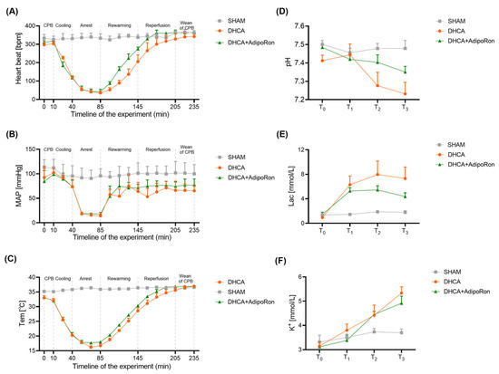 To observe the therapeutic effects of AdipoRon in vivo, we constructed DHCA rat models and administrated the DHCA rats with AdipoRon. The initial 10 min after the CPB establishment is an adapting stage for rats to the CPB circuit. In this process, the HR, MAP, body temperature, blood pH, concentration of lactic acid and potassium were similar among the sham, DHCA, and AdipoRon-treated DHCA rats (Figure 3). Then, the body temperature decreased to 20 °C with a 30 min cooling procedure in which the HR decreased from 300 to 100 beats per minute (bpm) in both DHCA and AdipoRon-treated DHCA rats. When the body temperature reached 20 °C, the rat’s blood was drained into the reservoir, and the heartbeat arrested along with a sharp drop of MAP (Figure 3A,B). It is worth noting that AdipoRon administration attenuated the increased lactic acid (Figure 3E) in DHCA rats during the cardiac arrest.
