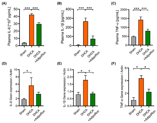 Acute inflammation is considered a critical component in the pathological process after DHCA [8,23]. Proinflammatory cytokines may significantly influence the development and maintenance of inflammation response. Therefore, we tested the concentrations of three major proinflammatory cytokines (IL-1β, IL-6, and TNF-α) in plasma and the cerebral cortex at the end of the DHCA procedure to investigate the anti-inflammatory effect of AdipoRon in vivo. After surgery, compared with sham rats, plasma concentrations of IL-6, IL-1β, and TNF-α in DHCA rats were significantly increased (Figure 4A–C), verifying the systemic inflammatory responses following DHCA. Meanwhile, the concentrations of IL-6, IL-1β, and TNF-α in AdipoRon-treated DHCA rats significantly decreased (p < 0.001). Due to the low concentration of cytokines in the cortex, we analyzed the transcription of cytokine genes and found that the mRNA of IL-1β (Figure 4E) and TNF-α (Figure 4F) in the AdipoRon group were significantly lower than that in the DHCA group, which means AdipoRon attenuates the acute neuroinflammation induced by DHCA.