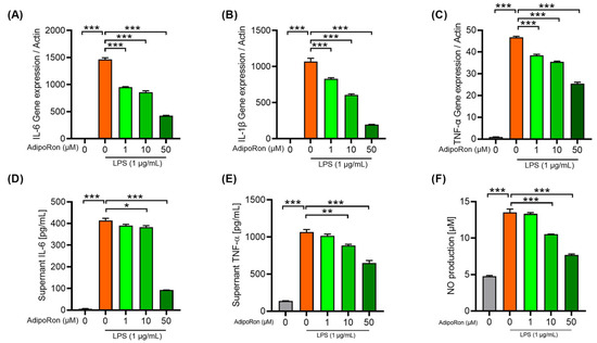 Microglia are the foremost and earliest inflammatory cells participating in the pathological process of neuroinflammation. Here, we used the BV2 cell, a commonly used cell line for the LPS-induced microglial inflammation model [26], to investigate the impact of AdipoRon on neuroinflammation in vitro. Due to the inconsistent reports, we firstly explored and confirmed that 1 μg/mL LPS could significantly induce the inflammatory response in BV2 cells. Additionally, to clarify the anti-inflammatory effects of AdipoRon, we assessed mRNA and protein levels of the downstream proinflammatory cytokines. Results showed that 0–50 μM AdipoRon dose-dependently inhibited the expression (Figure 7A–C) and secretion (Figure 7D,E) of proinflammatory cytokines (IL-6, IL-1β, TNF-α). Further, we found that 0–50 μM AdipoRon dose-dependently inhibited the NO production in the supernatant of LPS-induced BV2 cells (Figure 7F), which indirectly reflected a decreased expression of inducible nitric oxide synthase (iNOS). Taken together, we confirmed the anti-neuroinflammatory effect of AdipoRon in vitro.