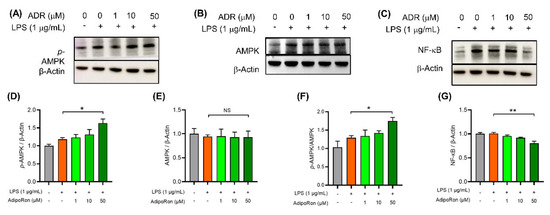 The expression of AMPK, p-AMPK and NF-κB protein of BV2 cells. Expression of (A) phosphorylation status of AMP-activated protein kinase (p-AMPK; molecular weight: 62 kDa), (B) AMPK-activated protein kinase (AMPK; molecular weight: 62 kDa), and (C) nuclear factor κB (NF-κB; molecular weight: 65 kDa) in BV2 cells was measured by immunoblot. BV2 cells were preincubated with AdipoRon (0–50 μM) or vehicle (dimethyl sulfoxide) for 1 h before stimulation with lipopolysaccharide (1 μg/mL) for 1 h. An amount of 10 μg protein of each sample was used for gel electrophoresis. Column bars indicated quantified levels of target protein/Actin expression ratios (D–G), and the results are relative values whereby the expression level of the sham control was normalized to 1.0. n = 3 in each group. Results are presented as the mean ± SEM. LPS: lipopolysaccharide; ADR: adipoRon. * p < 0.05 and ** p < 0.01. NS: p > 0.05.