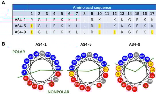 Amino acid sequences (A) and helical wheel representation (B) of the three types of peptides, i.e., AS4-1, AS4-5, and AS4-9. The mutated residues are emphasized in red with a yellow background. In (B), hydrophilic amino acids are shown with a blue background, and hydrophobic amino acids are shown with red and gray backgrounds. Green lines represent the interface between polar and nonpolar sides.