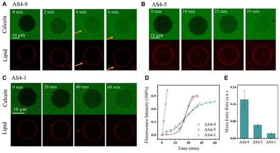 For a more quantitative comparison, corresponding scatter diagrams referring to the time-dependent increase in fluorescence intensity in the interior of the GUVs were drawn (Figure 2D). It is interesting to note that the profile ( and refer to the fluorescence intensities of the interior and surrounding environments of the GUV at t time, respectively) of AS4-9 can be fitted with a linear equation of (a and k are constants), while that of AS4-5 or AS4-1 can be roughly fitted with a sigmoidal equation of (a, k, and tc are constants) [,]. Herein, the linear dependence of on time indicates a constant entry rate of calcein into GUVs (i.e., constant k), suggesting that transmembrane pores or defects rapidly form on the GUV membrane within seconds upon AS4-9 addition. In contrast, the sigmoidal profile can be divided into three stages, including an initial negative exponent relation, followed by an approximately linear increase until reaching a saturation platform. This suggests an initially gradual accumulation and/or permeabilization process of peptides on membranes before the steady transmembrane diffusion of calcein through the formed defects or pores. The mean entry rate of calcein, calculated based on the linear state of individual profiles (marked with dashed lines in Figure 2D), confirmed the enhanced transmembrane leakage of calcein from AS4-1 to AS4-9 (Figure 2E).