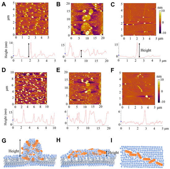 Representative AFM topographies of SLBs after AS4-9 exposure. Images (A–C) were obtained at different regions in a SLB membrane. (D–F) were captured from another sample. The corresponding height profiles are shown at the bottom. The orange background refers to the SLB surface, and the white regions refer to the aggregates/bulges on the surface. Before characterization, the membrane, consisting of PC lipids, was exposed to AS4-9 at 2.0 μg mL−1 for 40 min under a low-ionic-strength and neutral-pH condition. (G–I) Drawings showing the corresponding membrane structure in side (G,H) or top views (I). Orange rod: peptide; blue: lipid. Black arrows represent the height of the corresponding structures.