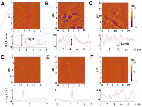 Representative AFM topographies of SLBs after AS4-5 (A–C) or AS4-1 (D–F) incubation. The images in (A–F) represent different membrane regions. The orange background refers to the SLB surface. Corresponding height profiles are shown at the bottom. The membrane, composed of PC, was incubated with peptides at 2.0 μg mL−1 for 40 min under a low-ionic-strength and neutral-pH condition before characterization. Blue arrows in (B) emphasize the raised edge of the hole. Black arrows represent the height or depth of corresponding structures.