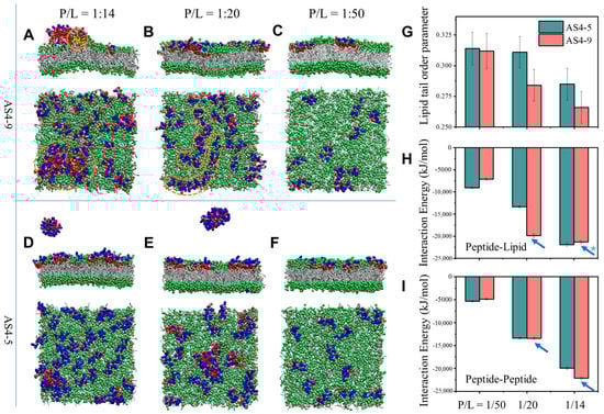 The interactions between AS4-5 and PC/PG membranes were also examined. Although only two residues of the sequence of AS4-5 were mutated, its membrane interaction states were obviously changed. For example, at the same P/L ratio of 1/14 (or 1/20), some of the AS4-5 peptides left the membrane surface and dispersed in the solution as aggregates (Figure 5D,E), rather than forming large peptide–lipid complexes in the membrane (Figure 5A). Calculations on the order parameter of lipid chains, following [], confirmed that AS4-5 produced weaker perturbation of the membrane than AS4-9 (Figure 5G). Enhanced interaction energy, both between peptides and lipids (Figure 5H), and between peptides (Figure 5I), was observed for AS4-9 compared with AS4-5, especially with high P/L ratios (marked with blue arrows), probably due to the higher degree of hydrophobicity of AS4-9 and the resultant, more complicated membrane interaction state (e.g., formation of peptide–lipid complex). Briefly, MD simulations proved the local number density-dependent distribution and accumulation of peptides on a membrane; moreover, the increased hydrophobicity of peptides (e.g., from AS4-5 to AS4-9) enhanced the membrane disturbance and strengthened the heterogeneity of the membrane structure after peptide actions.