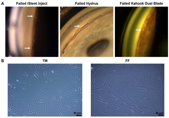 (A) Failed minimally invasive glaucoma surgery (MIGS) due to fibrosis. The arrow indicates scarring in iStent inject (left), Hydrus (middle), and the fibrotic membrane over the trabecular meshwork (TM) after Kahook Dual Blade surgery (right). (B) Phase-contrast microscopy images of human trabecular meshwork cells (TM, left) and human conjunctival fibroblasts (FF, right) cultured on plastic dishes. Scale bar, 50 µm.
