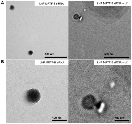 Negative staining transmission electron microscopy (TEM) images of LNP-MRTF-B siRNA and LNP-MRTF-B siRNA + c. (A) Lower magnification. Scale bar, 500 nm. (B) Higher magnification. Scale bar, 100 nm.