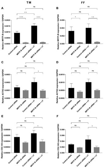 The expression level of ACTA2 gene in TM and FF cells treated with LNP-MRTF-B siRNA was also reduced by 27.5% (p = 0.40) and 36.8% (p = 0.37), respectively, compared to LNP-Control siRNA. Meanwhile, LNP-MRTF-B siRNA + c reduced the gene expression of ACTA2 by 52.8% (p = 0.03) and 50.2% (p = 0.08) in both TM and FF cells, respectively, compared to LNP-Control siRNA + c. The addition of c further decreased ACTA2 gene expression in both TM and FF cells, and with statistical significance for TM cells (Figure 4C,D).