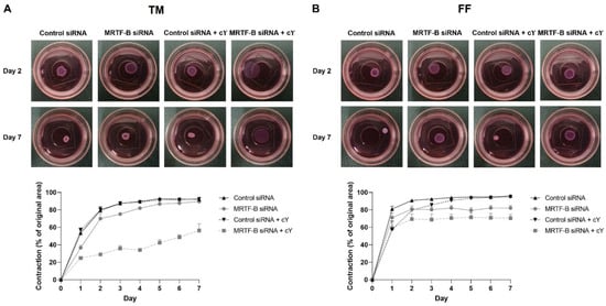 Three-dimensional collagen contraction assay of human (A) TM and (B) FF cells after transfection with four lipid nanoparticles (LNP-Control siRNA, LNP-MRTF-B siRNA, LNP-Control siRNA + c, LNP-MRTF-B siRNA + c) throughout the 7 days. Representative gel areas on day 2 and day 7 are shown.