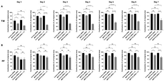 For FF cells, the contraction area significantly increased on the first two days and stabilised for the following five days for all four LNP-siRNAs (Figure 6B). The differences between LNP-MRTF-B siRNA and LNP-Control siRNA were statistically significant on days 4, 5 and 7, whereas the differences between LNP-MRTF-B siRNA + c and LNP-Control siRNA + c were statistically significant on every day from days 4 to 7 (Figure 7B). There were no statistically significant differences between the presence of c and the absence of c in FF cells, which was different from the TM cells (Figure 7B). On day 7, the LNP-MRTF-B siRNA + c-treated FF-collagen gel showed the lowest matrix contraction with a value of 70.5 ± 4.4%, which was 25.8% less than the LNP-Control siRNA + c-treated FF-populated collagen gel but still more than that of the corresponding TM-populated collagen gel. Additionally, the FF-collagen gel transfected by LNP-MRTF-B siRNA without c contracted 82.1 ± 2.7%, which was 14.4% less than the LNP-Control siRNA (Figure 6B and Figure 7B).