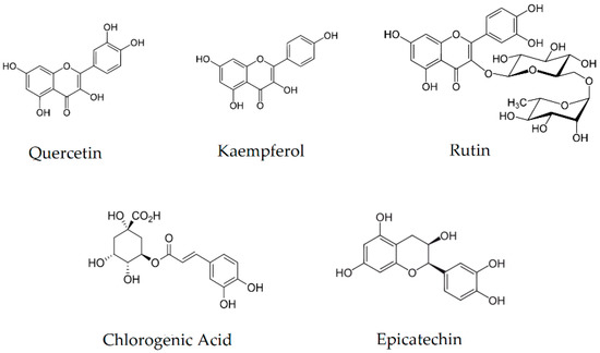 The high contents of rutin, chlorogenic acid, and epicatechin indicate the potential for use in diabetes [28,29,30]. All indicated compounds show the potential to inhibit α-glucosidase and α-amylase, which are responsible for the breakdown of carbohydrates into simple sugars. The potential to inhibit digestive enzymes responsible for the breakdown of complex sugars translates into the possibility of using the raw material in supporting the treatment of type 2 diabetes, particularly in the early stages of the disease. This prevents a rapid increase in postprandial blood sugar [26,31].