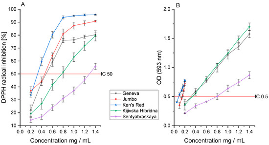 A similar analysis was carried out in the FRAP assay, confirming Ken’s Red’s highest activity (IC0.5: 0.064 ± 0.005 mg DM/mL). However, here, we did not observe a similar activity of the Jumbo (IC0.5: 0.149 ± 0.012 mg DM/mL) and Geneva (IC0.5: 0.320 ± 0.009 mg DM/mL) cultivars; significantly higher activity of the Jumbo cultivar was observed, similar to the Ken’s Red cultivar (Figure 2B). On the other hand, the Geneva variety was characterized by lower activity, this time similar to the Kijivska Hibridna variety (IC0.5: 0.333 ± 0.023 mg DM/mL). Here, we found a correlation between TPC and the activity studied, which was verified by the Pearson correlation coefficient (p < 0.05). The highest activity characterizes the variety with the highest content of total polyphenols. As in the case of the DPPH assay, the observed antioxidant activity is lower than that of the reference substance; however, in the FRAP assay, the Ken’s Red variety and Trolox (IC0.5: 0.041 ± 0.004 mg/mL) showed similar activity.