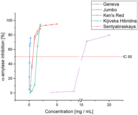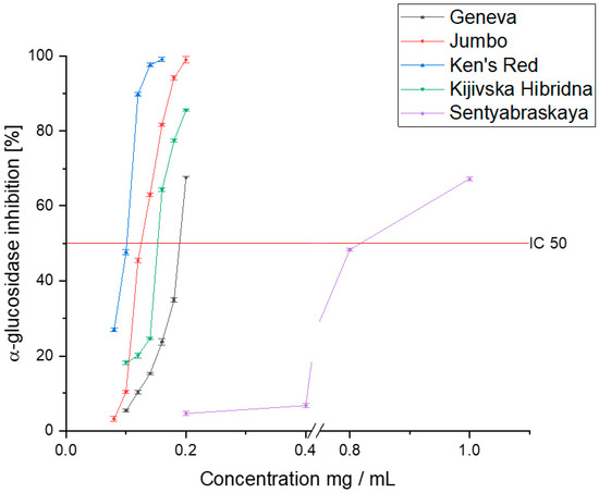 The results indicate a high potential for inhibiting α-glucosidase (Figure 3). According to the results of the antioxidant capacity, the Ken’s Red variety showed the highest level of inhibition of the tested enzyme (IC50: 0.098 ± 0.007 mg DM/mL). The Geneva, Jumbo, and Kijivska Hibridna cultivars showed similar activity (0.187 ± 0.015, 0.132 ± 0.011, and 0.155 ± 0.014 mg DM/mL, respectively). However, despite the lower activity, the raw material should have a high capacity for inhibiting α-glucosidase. As a reference, the acarbose activity should be cited, which is the reference for which the determined IC50 value was 1.251 ± 0.071 mg/mL. The Sentyabraskaya variety, on the other hand, was characterized by a significantly lower ability to inhibit α-glucosidase (IC50: 0.826 ± 0.045 mg DM/mL). Despite a lower affinity for the enzyme, we can characterize all the tested varieties as showing potential to inhibit enzymes, and thus showing potential for use in diabetes therapy. Earlier studies indicated activity at a similar level of activity of the raw material [49]. Differences can be attributed to the different varieties with variable profiles of active compounds and the differences in the extraction method and the extractant used. However, there is a trend showing that the Acnitidia species has a potentially positive effect on alleviating the symptoms of DM2.