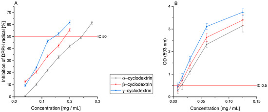 The antioxidant activity of the extracts obtained using selected cyclodextrins in the (A) DPPH and (B) FRAP assay. Significance at p ≤ 0.05.