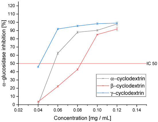 Further analysis of the in vitro activity allowed us to estimate the change in the activity of the obtained cyclodextrin-based extracts (Figure 6). In all obtained systems, an improvement in the ability to inhibit α-glucosidase was observed. Again, γ-CD (IC50: 0.040 ± 0.002 mg DM/mL) turned out to be the best; however, in contrast to the antioxidant activity, we observed that the activity of α-CD (IC50: 0.059 ± 0.005 mg DM/mL) was higher than β-CD (IC50: 0.084 ± 0.007 mg DM/mL). The obtained differences result from the richness of the studied extract and the entourage effect, which is extremely important in the case of enzymatic inhibition analysis. The ratio between successive active compounds plays a significant role in this process. It is more important than the specific concentration due to the complementation of the mechanisms of action. In addition, it should be noted that despite the differences in activity, all of them showed a significantly higher ability to inhibit α-glucosidase than acarbose (IC50: 1.251 ± 0.071 mg/mL). Moreover, inhibition of the enzymes α-glucosidase and α-amylase can control glycemia and improve the response of pharmacotherapy by limiting the absorption of simple sugars [66].