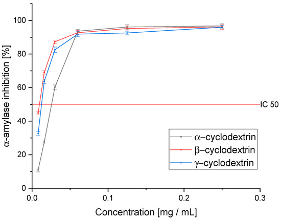 In the tested assay of α-amylase inhibition, we observed a significantly greater improvement in activity against the enzyme than in the case of α-glucosidase (Figure 7). Interestingly, in this assay, β-CD was the best, as it improved the activity over 10-fold compared to the pure extract (IC50: 0.008 ± 0.002 mg DM/mL). On the other hand, γ-CD, which turned out to be the most active, also showed high activity, but the observed improvement was almost 7-fold (IC50: 0.012 ± 0.003 mg DM/mL). α-CD, in this case, showed only a little over a 2-fold improvement in activity (IC50: 0.030 ± 0.003 mg DM/mL). As in the case of the pure extract, we observed a significantly higher ability to inhibit the enzyme than acarbose (IC50: 0.218 ± 0.015 mg/mL).