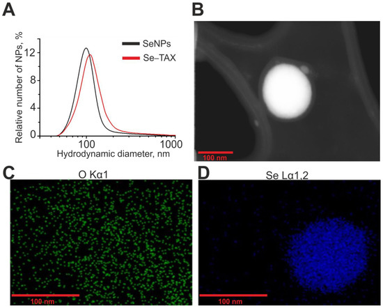 Shape, chemical composition, and size distribution of SeNPs and Se–TAX. (A) Size distribution of SeNPs (black) and Se–TAX. Data obtained using an analytical disk centrifuge and confirmed by DLS. (B) TEM image of an individual SeNP with a diameter of about 100 nm. (C) The distribution of oxygen atoms in panel (B). (D) The distribution of selenium atoms in panel (B).