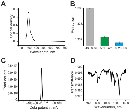 First of all, the absorption spectrum of the Se–TAX sample was obtained; it is represented in Figure 2A. The maximum of absorption is located on the 289 nm wavelength. The peak shows a slight extension on the 320–360 nm. Additionally, the refraction index of Se–TAX was registered; the data are represented in Figure 2B. The zeta potential increased to −20 mV in the Se–TAX complex (Figure 2C). Additionally, the Se–TAX complex was studied with the use of FTIR spectroscopy. The resulting FTIR spectrum is represented in Figure 2D. It shows the dependence of transmittance from the wavenumber. The presented spectrum of the Se–TAX complex contains the bands specific for the bond vibrations in the Se–TAX complex. Data on the microscopic examination of nanoparticles with adsorbed taxifolin molecules are not carried out, since the taxifolin “fur coat” has an extremely low contrast.
