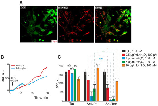 Dose-dependent effect of 24 h preincubation of cerebral cortex cells with taxifolin (TAX), selenium nanoparticles (SeNPs), and selenium–taxifolin nanocomplex (Se–TAX) on ROS production induced with the addition of 100 μM H2O2. (A) Simultaneous staining of cerebral cortex cells with a DCF probe (to measure ROS production) and a mitochondrial probe (MitoTracker Red FM, MTR-FM) and their combination (Merge). (B) ROS production in neurons (red curve) and astrocytes (blue curve) of the cerebral cortex in culture with the addition of 100 μM H2O2. The curves of ROS production averaged over several dozens of cells, recorded by increasing the fluorescence of the DCF probe, are presented. (C) Effect of 24 h cell incubation with various concentrations of TAX, SeNPs, and Se–TAX on H2O2-induced ROS production. Data obtained with an automated multiplate reader (Spark™ 10M multimode microplate reader) are presented. Data are shown as the mean of fluorescence intensity, arb.units ± S.E.M. Statistical analysis of experimental groups versus H2O2 (black bars) was performed with paired t-test. Significance between group means: *** p < 0.001, ** p < 0.01 and * p < 0.05. n/s—insignificant differences.